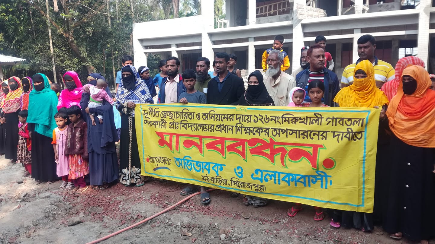 মঠবাড়িয়ার ১২৬ নং মিরুখালী গাবতলা সরকারি প্রাথমিক বিদ্যালয়ের প্রধান শিক্ষকের বিরুদ্ধে মানববন্ধন