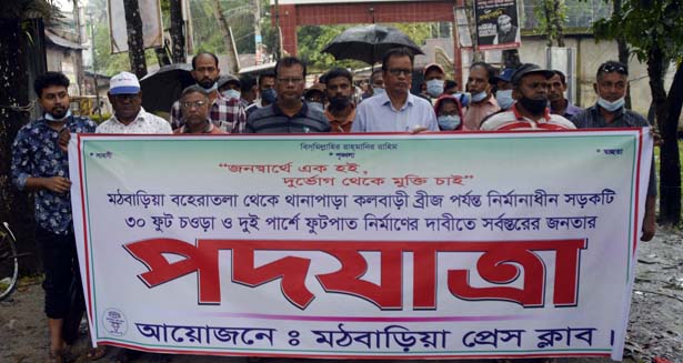 মঠবাড়িয়া পৌরশহরের বেহাল প্রধান সড়ক ৩০ ফুট প্রশস্থ করে দ্রুত নির্মাণের দাবিতে পদযাত্রা
