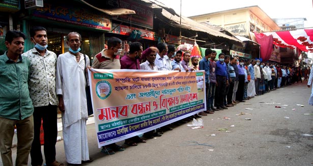 সুনামগঞ্জে হিন্দু পল্লীতে হামলার প্রতিবাদে মঠবাড়িয়ায় মানববন্ধন